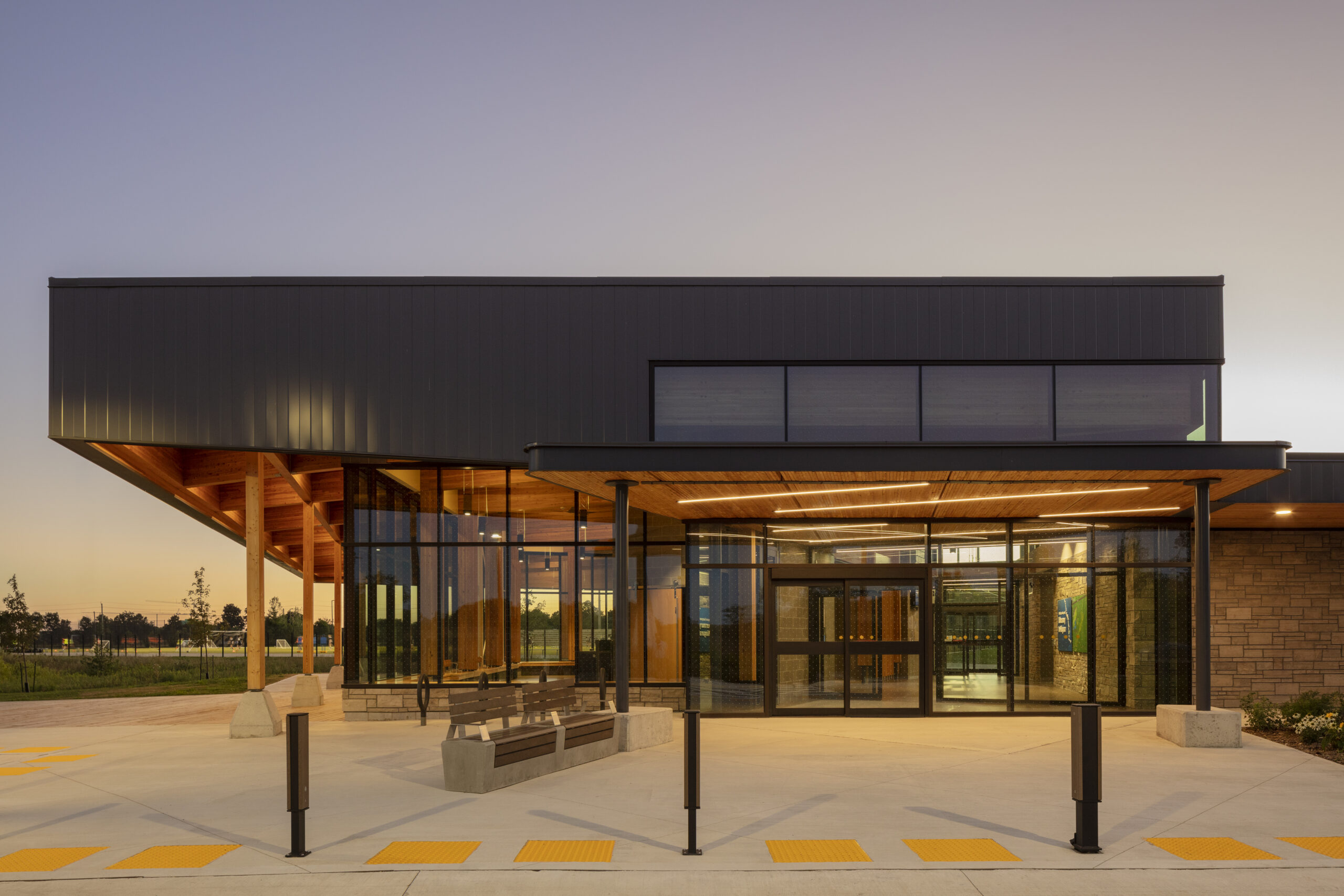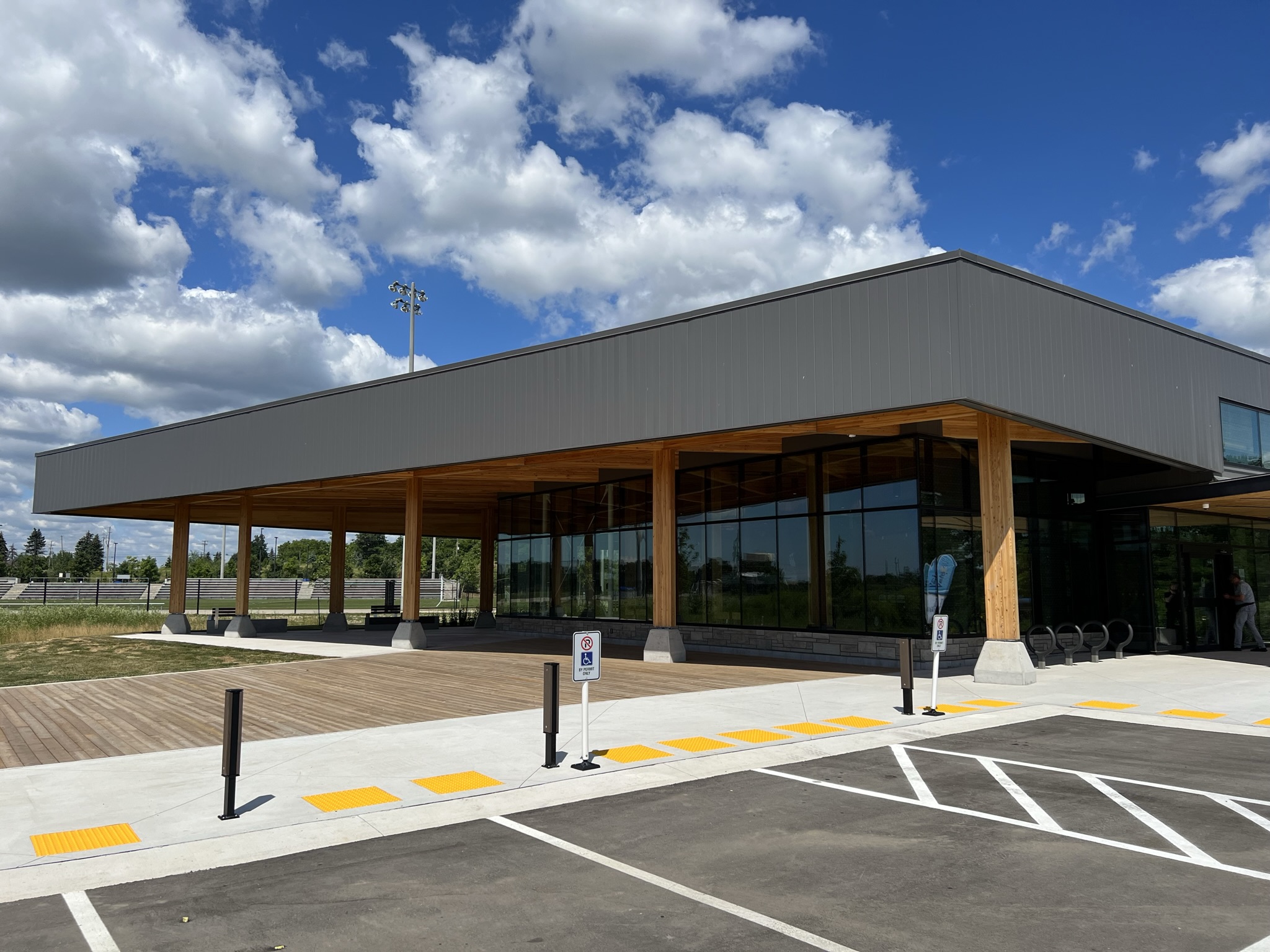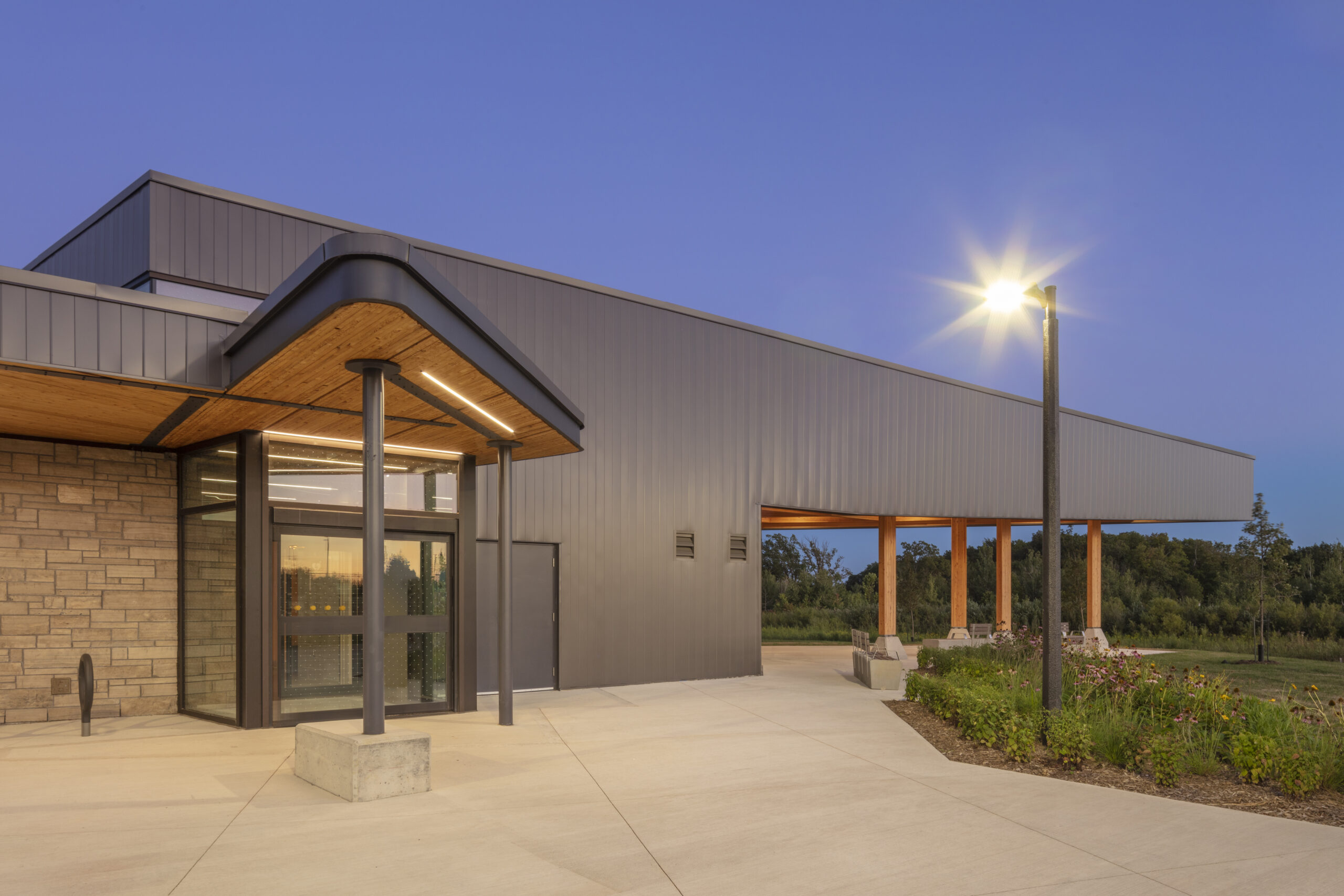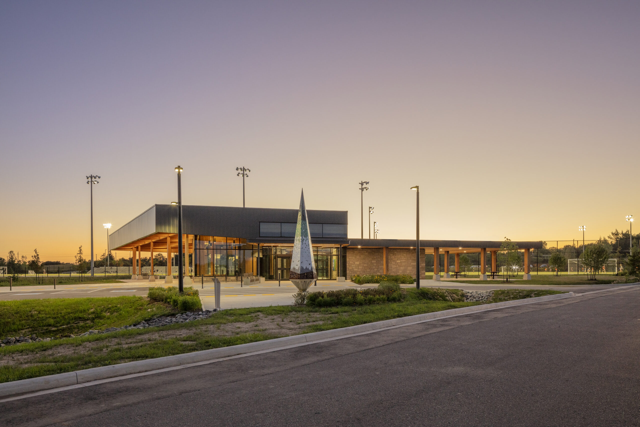 This 400 m² (4,500 ft²) fully accessible pavilion provides a welcoming community space with public and universal washrooms, a spacious lobby with servery, storage, and building services. A large canopy extends shade and seating, while an outdoor terrace overlooks a scenic pond and connects to lit pathways, parking, and a drop-off zone.