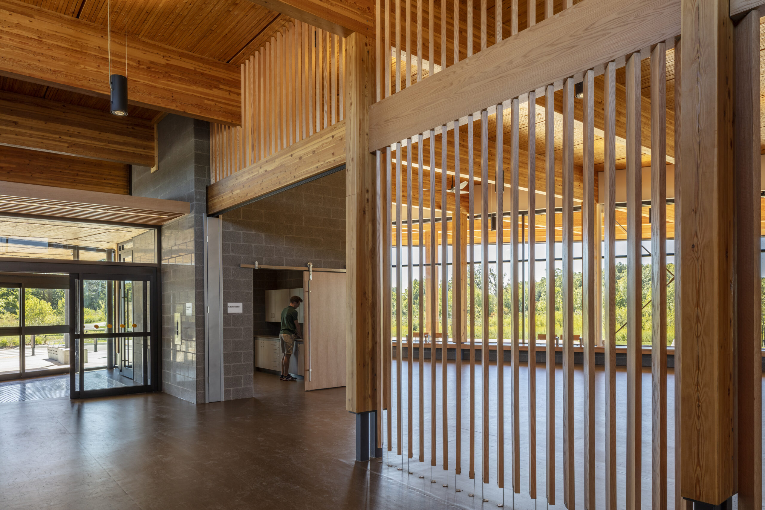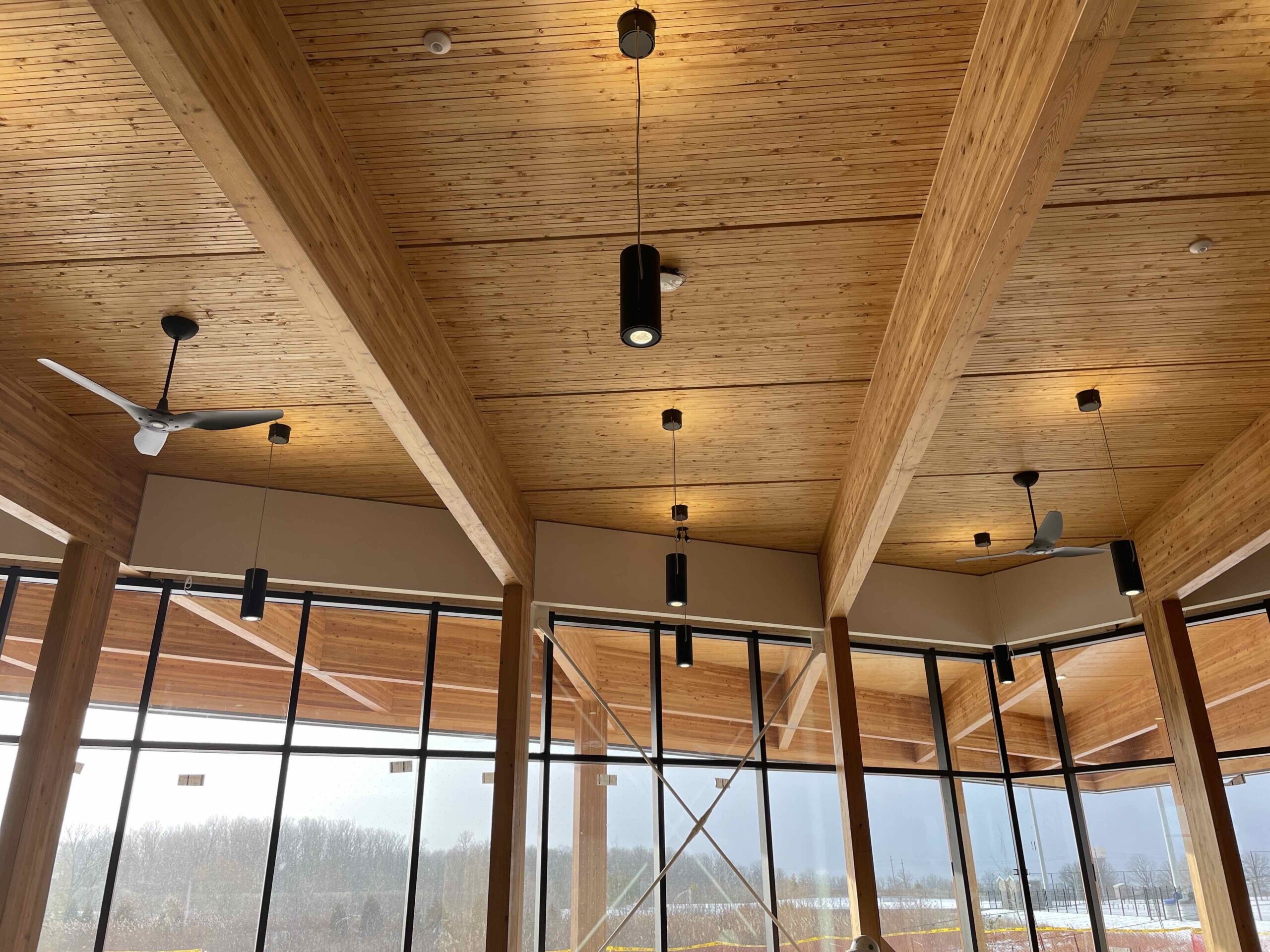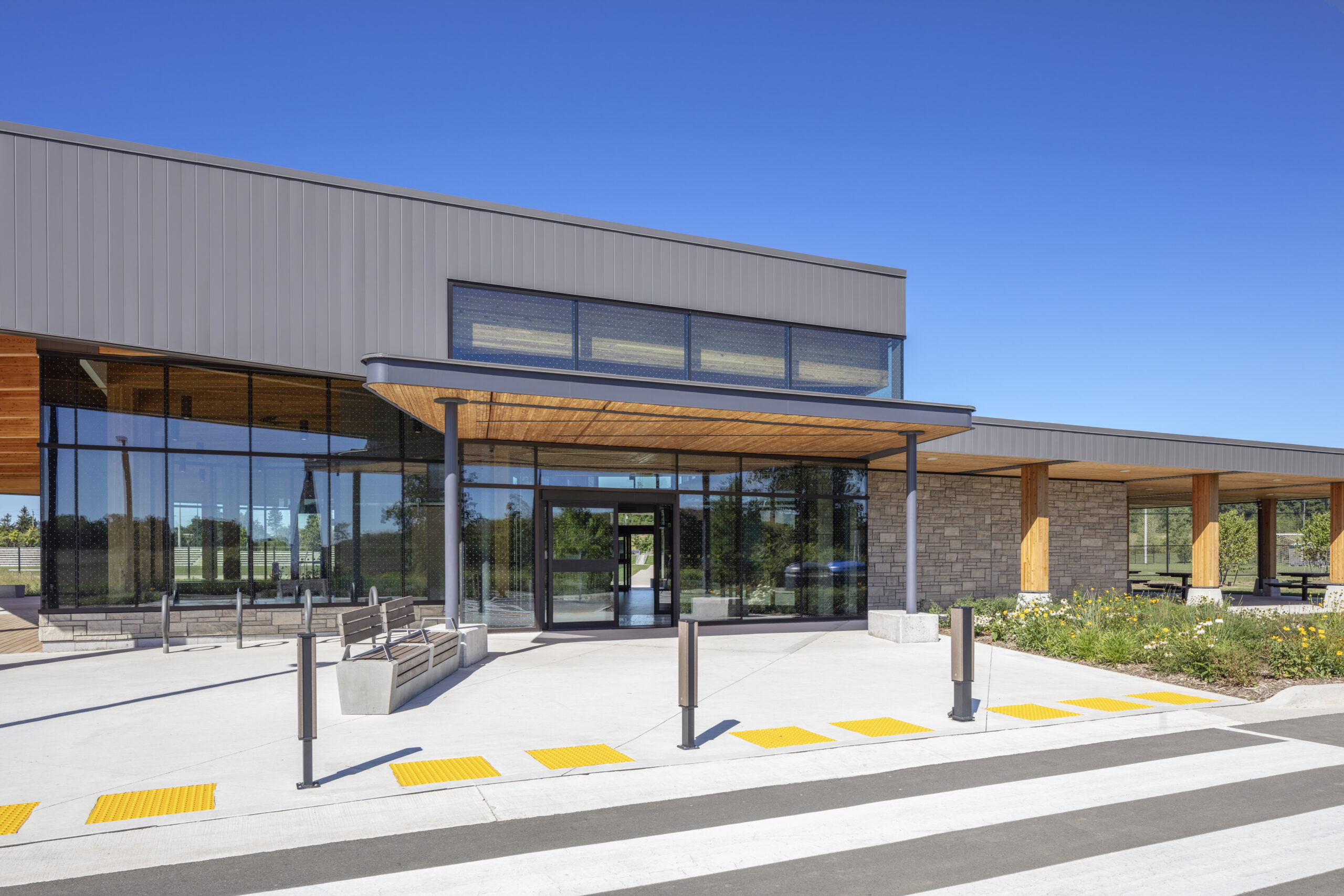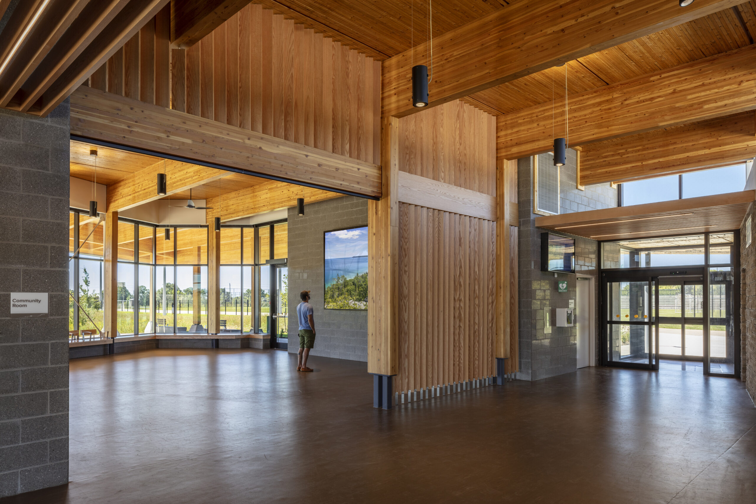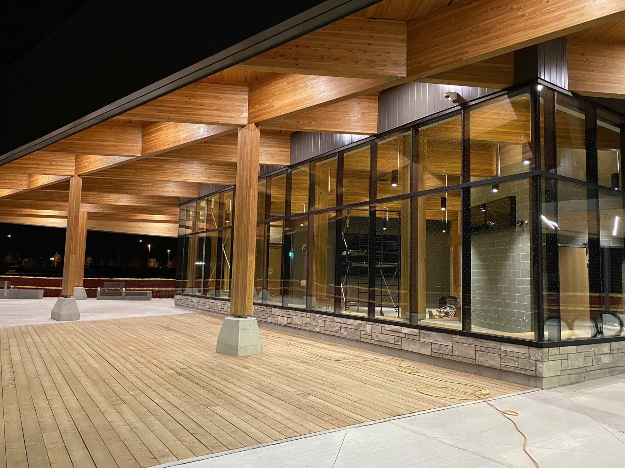 This 400 m² (4,500 ft²) fully accessible pavilion provides a welcoming community space with public and universal washrooms, a spacious lobby with servery, storage, and building services. A large canopy extends shade and seating, while an outdoor terrace overlooks a scenic pond and connects to lit pathways, parking, and a drop-off zone.